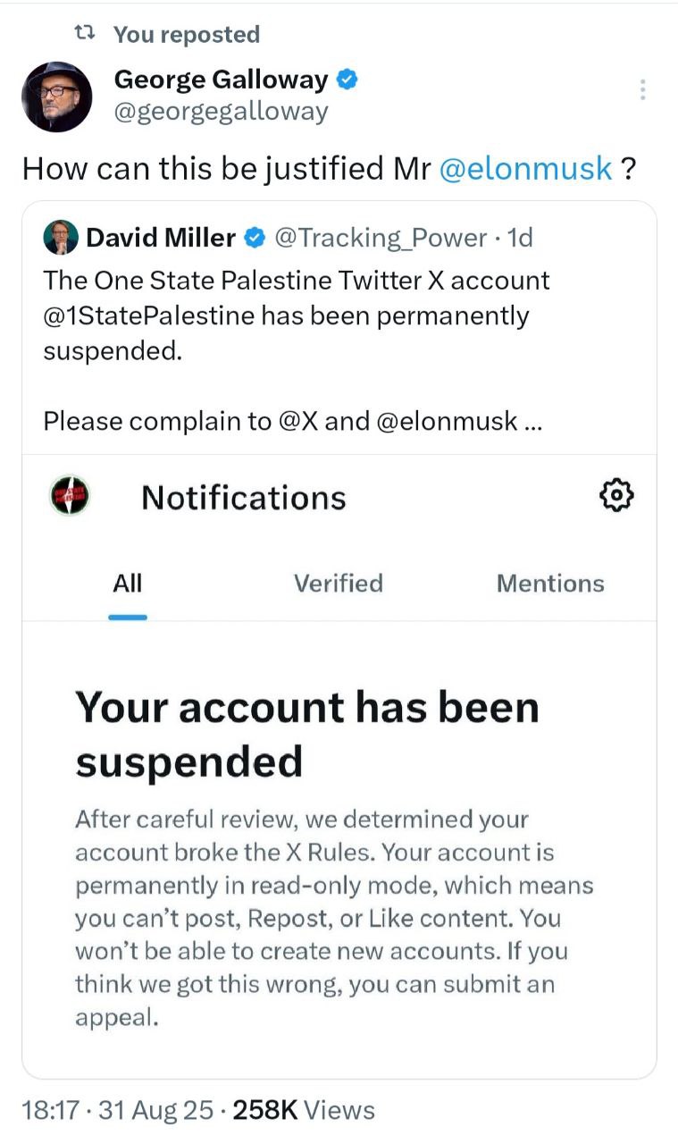 The One State Palestine campaign has now been banned on X. The recent broadcasts (two in total) were seen more than half a million times, and the ban comes as news emerges that George Galloway's Moats has hit record numbers of viewers.