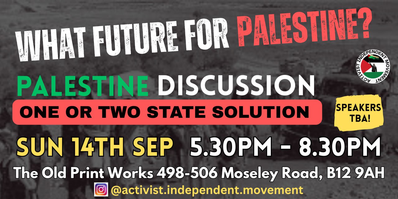 The Activist Independent Movement have organised this public discussion of the issues surrounding the One State vs Two State Solution in the Middle East. Speakers from both sides of the debate have been invited, including sitting Labour Councillors, speakers from Your Party, the Workers Party, PSC and others.